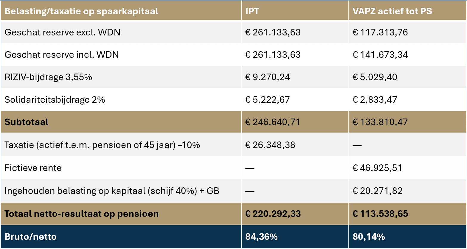 - Fictieve rente: 5% van het kapitaal gedurende 10 jaar belast aan het marginaal tarief (80% bij pensioen op 65 jaar)